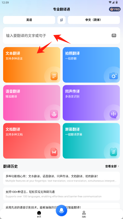 1、文本翻译可对输入的文字或句子进行翻译,操作简单,直接输入即可。