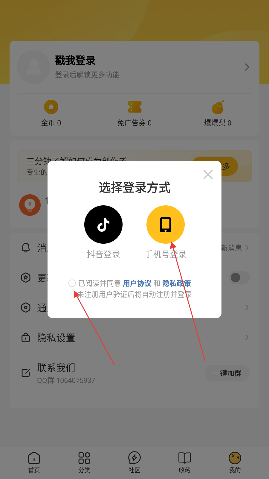 3、在选择登录方式窗口,勾选【已阅读并同意】,再点击【手机号登录】。