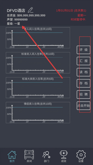 2、在首页,能查看酒店【总资金】【声望】等信息,还可进行【评级】【汇报】等操作,点击【点击开始】推进经营。