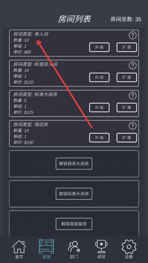 3、到房间界面,可查看【房间列表】,对不同类型房间进行【升级】【扩建】,也能解锁新房间类型。