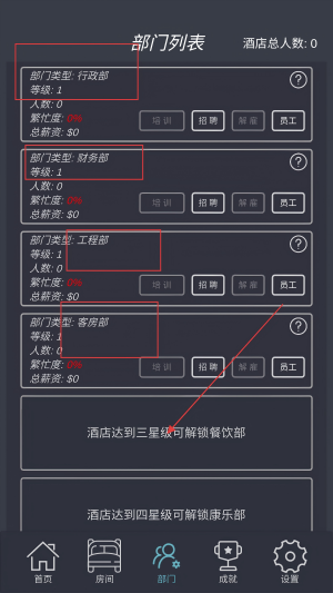 4、在部门界面,能看到【部门列表】,对各部门进行【培训】【招聘】等,提升部门能力,酒店升级还能解锁新部门。