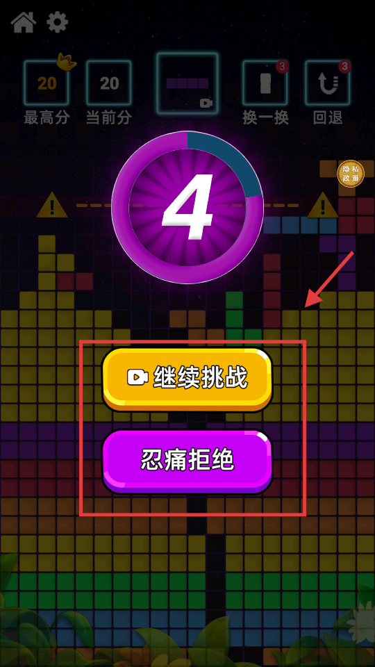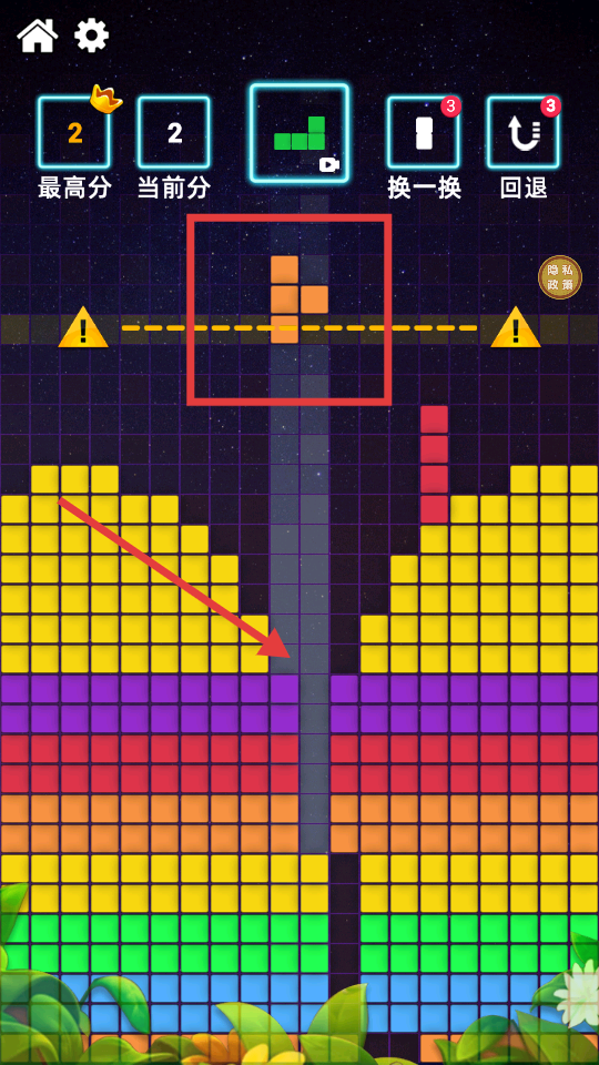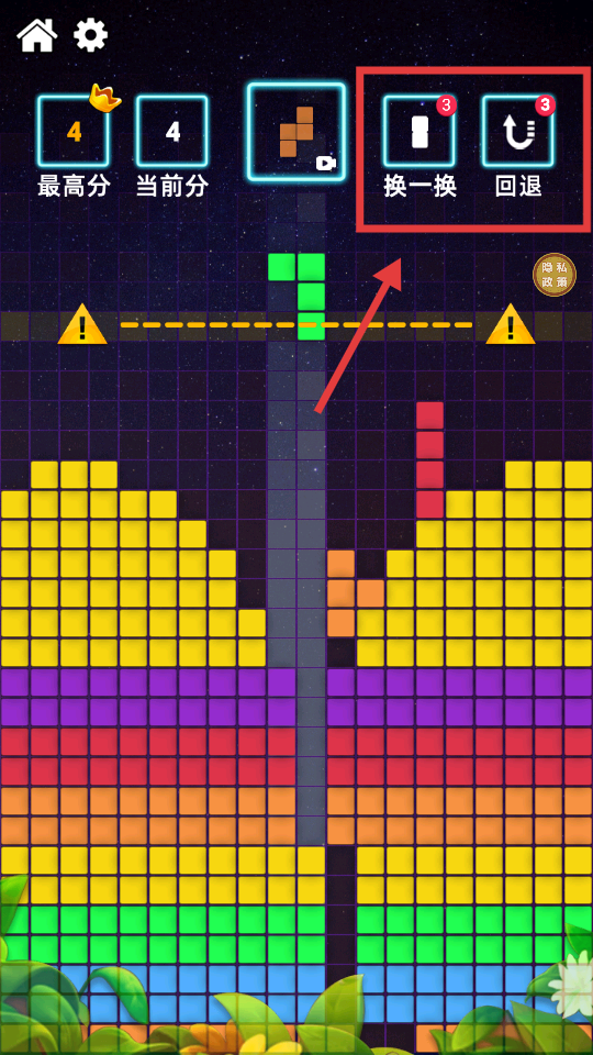3、若方块形状不利消除,可使用【换一换】或【回退】道具,合理利用能提升消除效率。