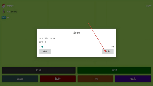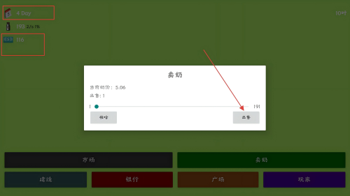 4、随着天数增加,资源积累后,再次【卖奶】时,可根据当前牛奶价格和库存,选择合适出售量,获取更多收益。