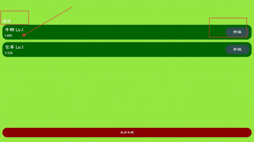 3、进入【建造】界面,能看到【养棚】【仓库】等可升级建筑,点击【升级】,可提升建筑等级,增强生产或存储能力。