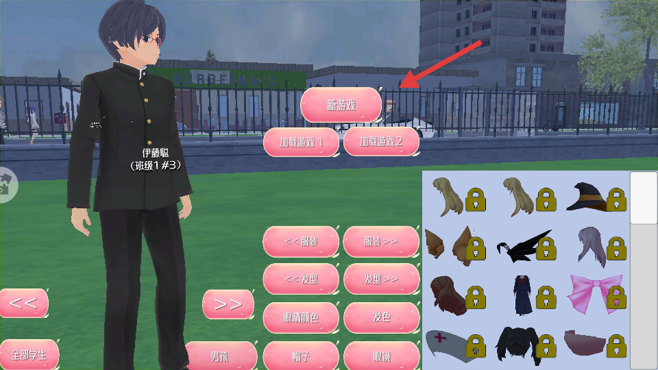 1、初始界面点击【新游戏】开始,可通过【服饰】【发型】【眼睛颜色】【发色】等按钮自定义角色伊藤聪(班级1/3)外观。