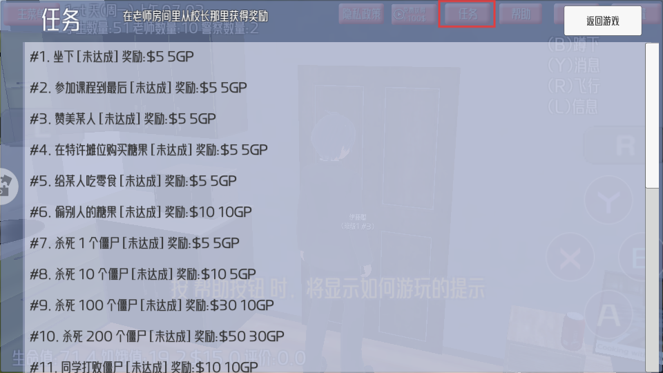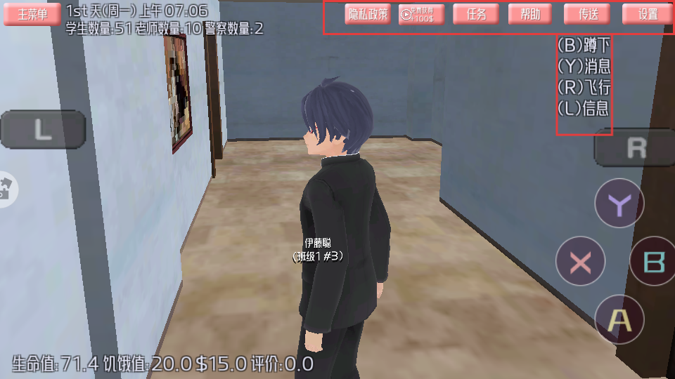 2、进入游戏后顶部有【主菜单】,底部显示【生命值】【饥饿值】【$】【评价】,右侧【B-蹲下】【Y-消息】【R-飞行】【L-信息】是动作键。