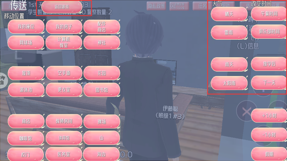 4、点击【传送】按钮可选【我的座位】【我的房子】【配件商店】等移动,右侧能改【晴天】【雷雨】【午餐时间】【放学后】等。