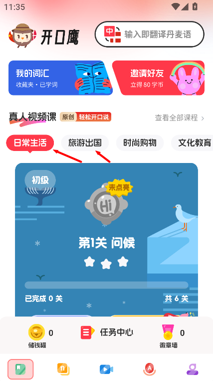 1、进入首页后,可选择日常生活、出国旅游和时尚购物等主题学习模块,覆盖不同场景所需知识。