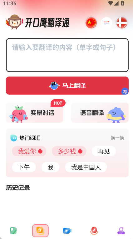 2、实景对话功能结合语音翻译工具,能够模拟真实交流,提升表达与理解能力。