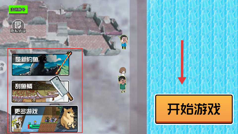 1、游戏主界面点击右侧【开始游戏】按钮,可进入钓鱼玩法,左侧有【楚新钓鱼】【刮鱼鳞】【更多游戏】等选项。