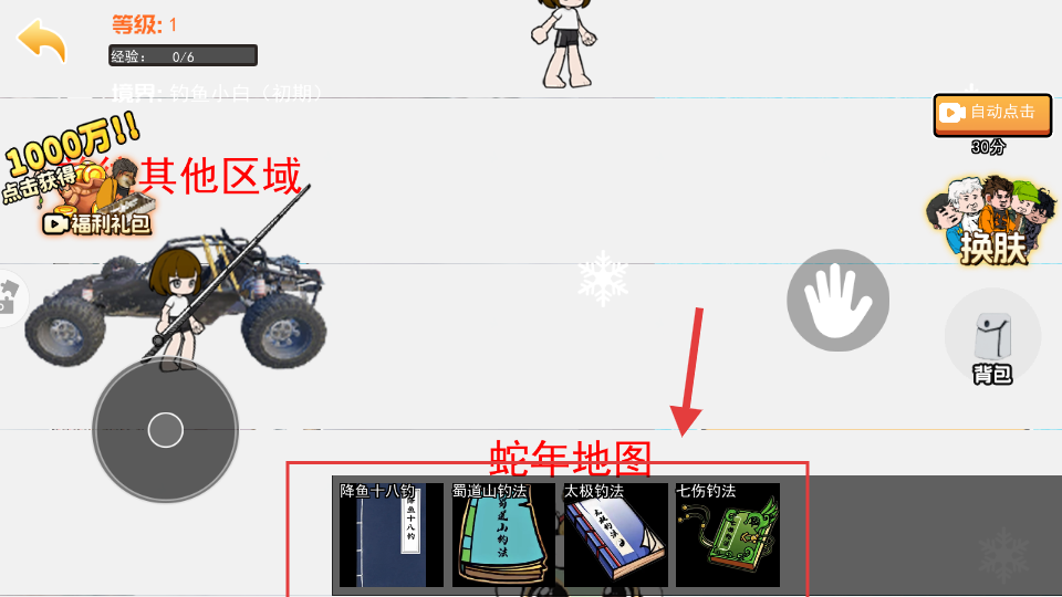 2、进入游戏后等级为【1】,经验【0-6】,可选择【蛇年地图】,下方有【降鱼十八钩】【蜀道山钓法】等技法。