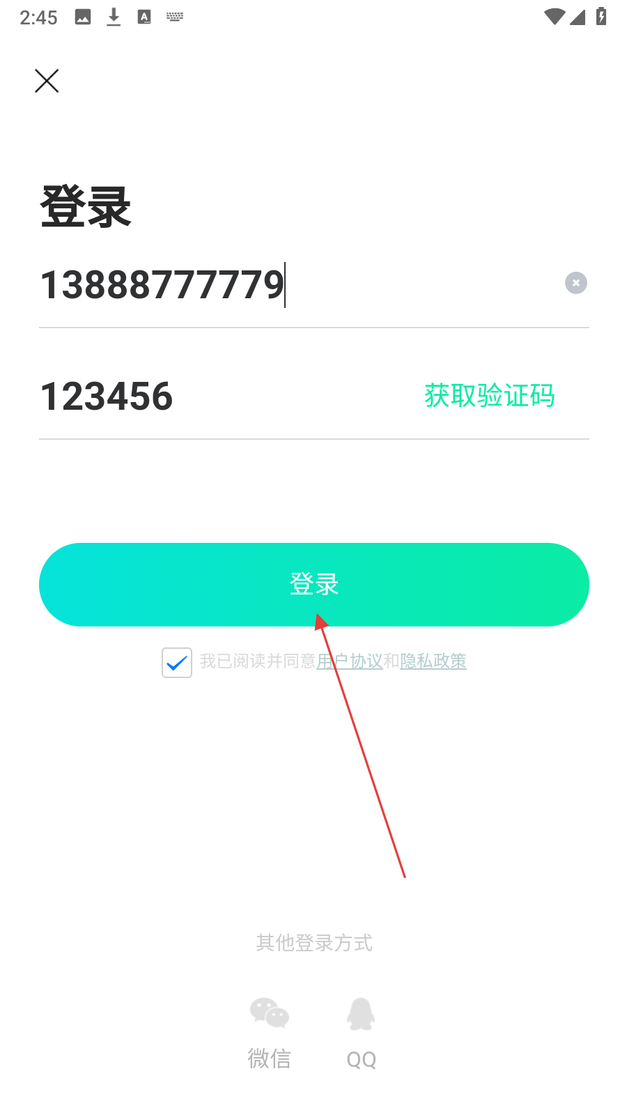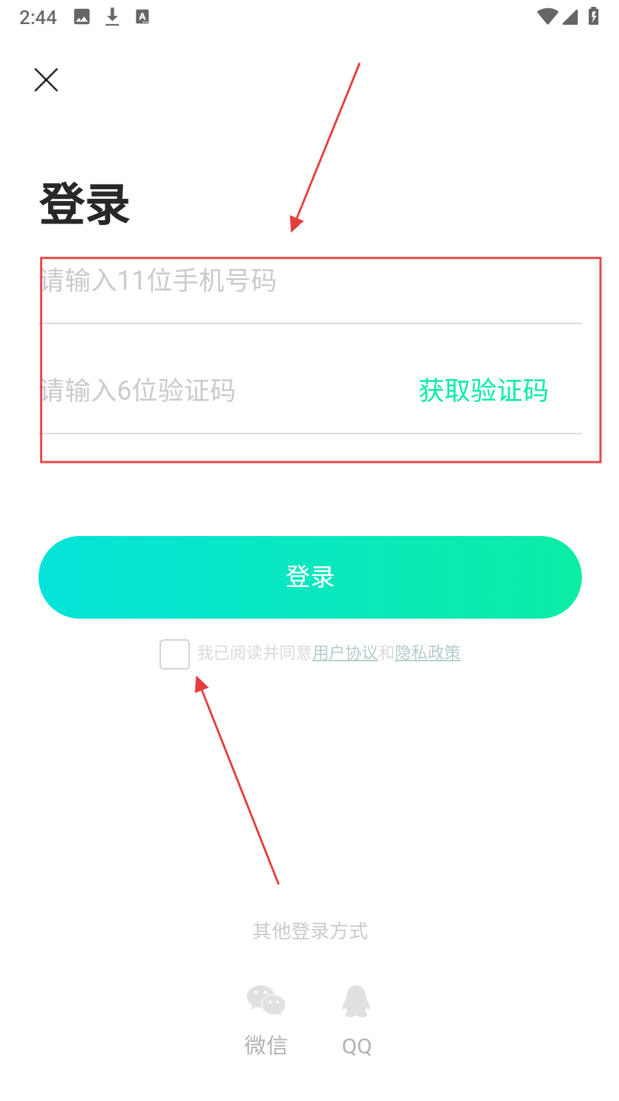 3、在登录页面,勾选【协议】,输入【手机号码和验证码】。