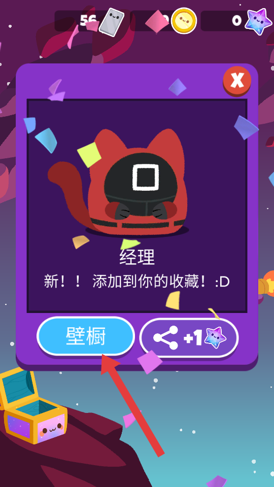 4、打开宝箱获得物品,点击【红箭头】所指的【壁橱】按钮,将获得的物品添加到收藏。