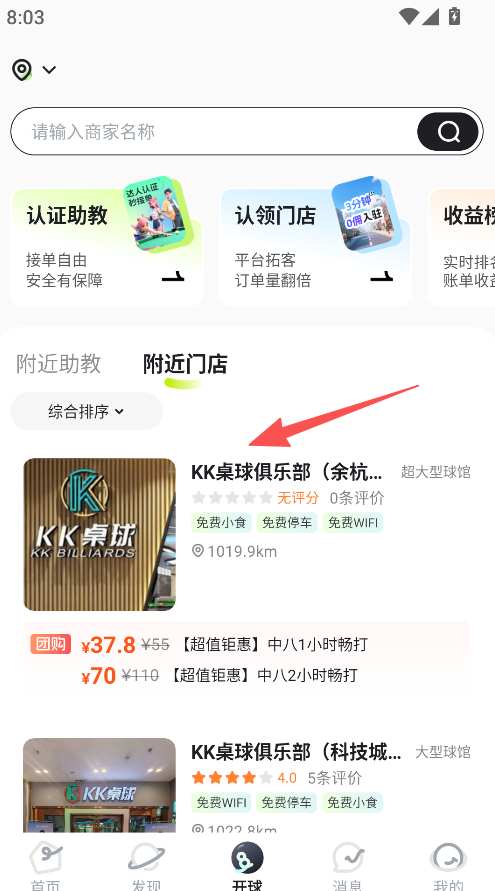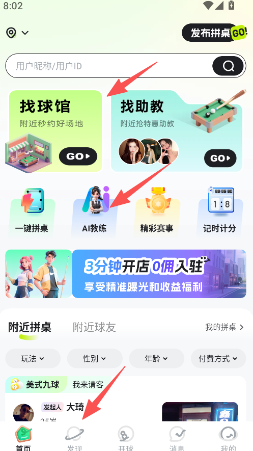 3、覆盖大量同城台球门店资源,将门店信息与约球、助教服务联动,减少台球运动筹备环节。