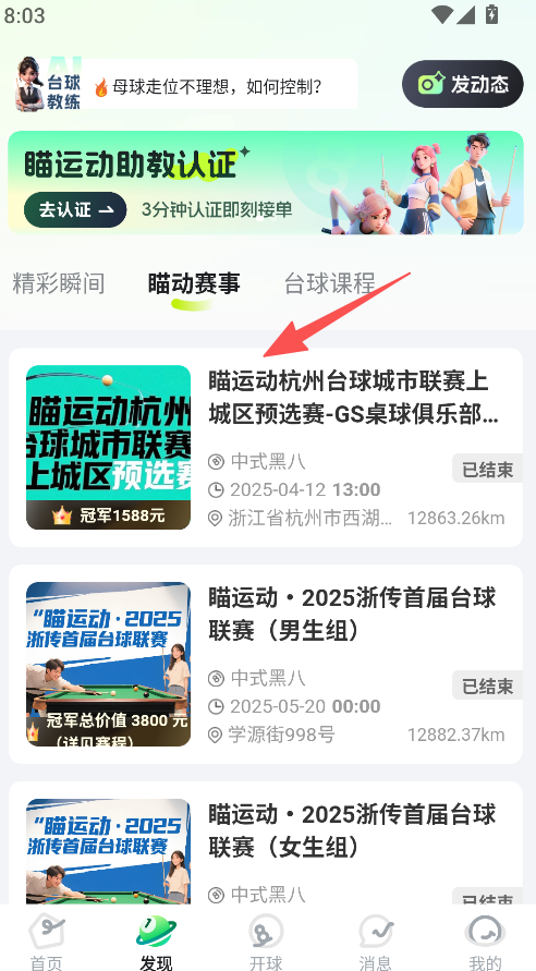 《瞄运动》聚焦台球运动服务,可快速查找附近球馆、抢特惠助教,还有AI教练辅助。支持拼桌约球,精准匹配球友,覆盖超500家同城门店。能获取精彩赛事信息,提供台球教学内容,助力提升球技,同时方便台球爱好者社交互动,打造一站式台球体验。