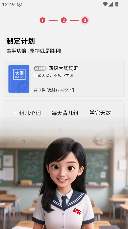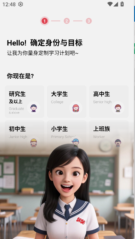 1、进入soso背单词后,首先进行身份确认与学习目标的设定,以便系统根据情况推荐合适的学习方案。