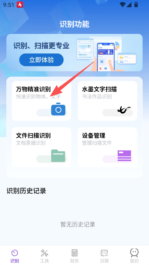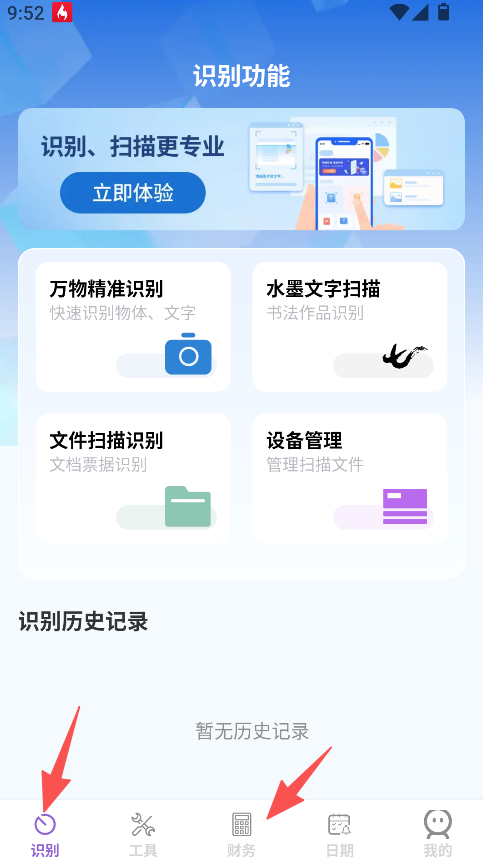 3、界面操作简洁直观,底部导航栏清晰划分识别、工具、财务等板块,能快速切换功能区域,提升使用便捷性。