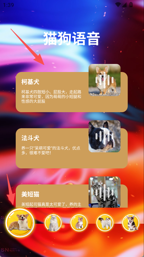 3、切换到“猫狗语音”板块,点击底部宠物图标,查看对应宠物介绍。