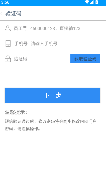 2、进入密码找回页面后,按照提示填写员工号、绑定手机号及收到的验证码。
