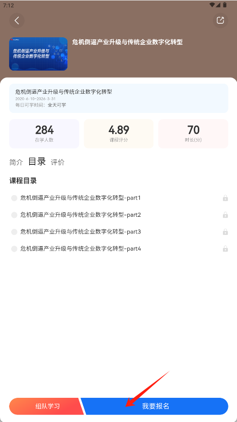 2、课程详情页底部点击蓝色“我要报名”按钮,完成课程报名。