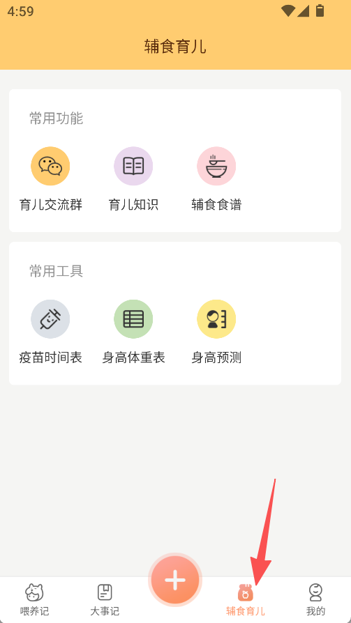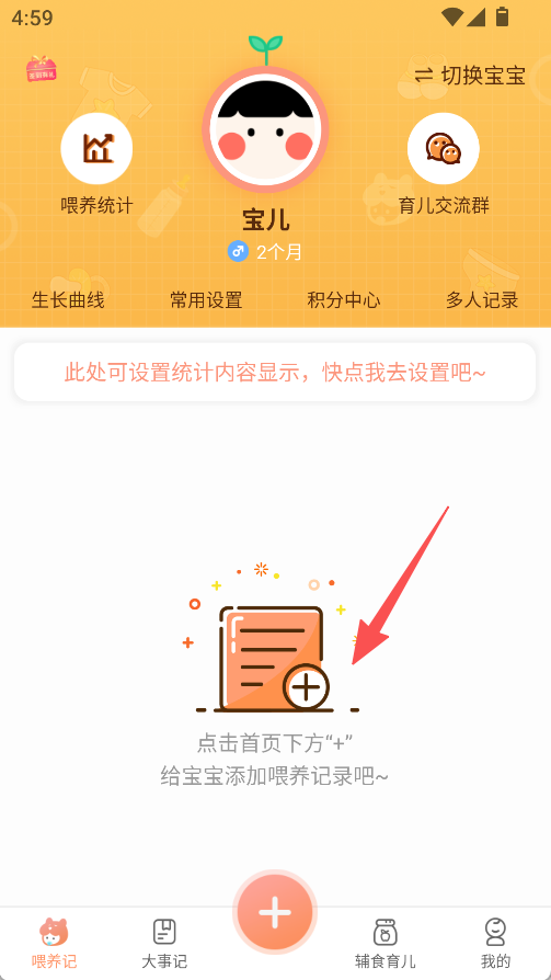 1、打开首页点击“+”可添加宝宝喂养记录。