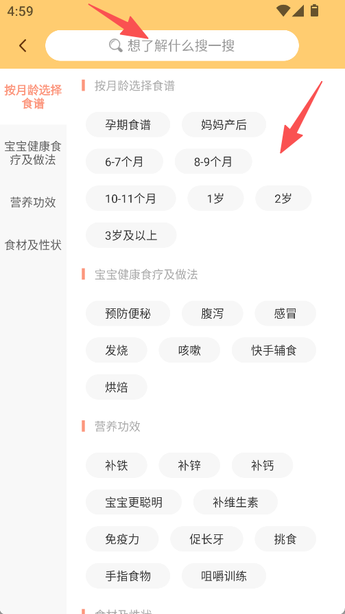3、在辅食育儿板块,可通过搜索栏搜索,也能按月龄或健康需求等选择辅食食谱。