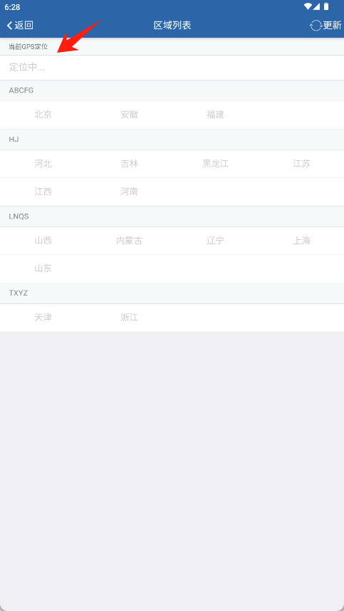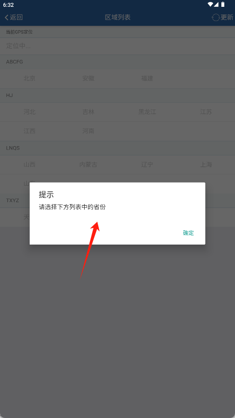 2、进入区域列表页后根据GPS定位或手动查找选择所属省份。