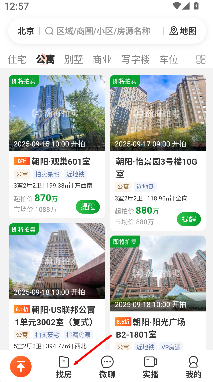 1、进入软件首页后,点击找房板块,进入房源展示页面,查看平台提供的法拍房信息。