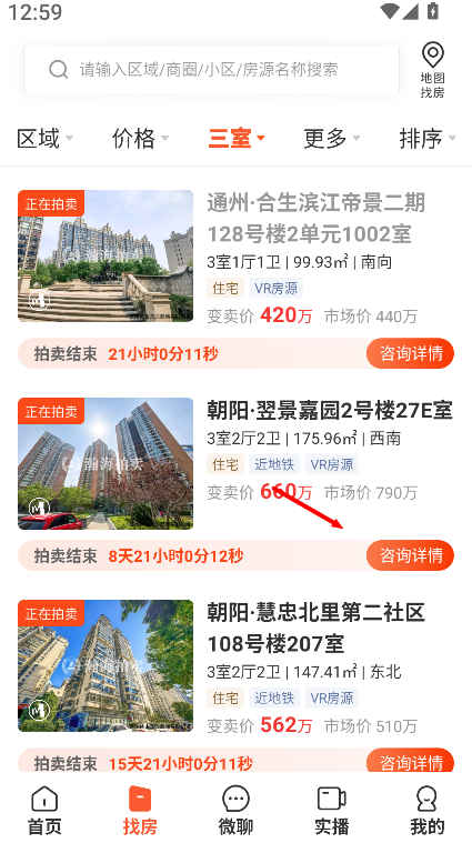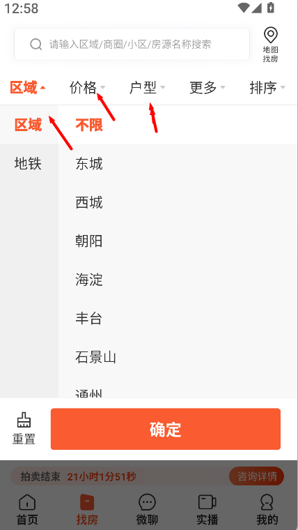 2、在搜索栏中可根据区域、价格、户型等条件进行筛选,快速定位符合意向的房源。