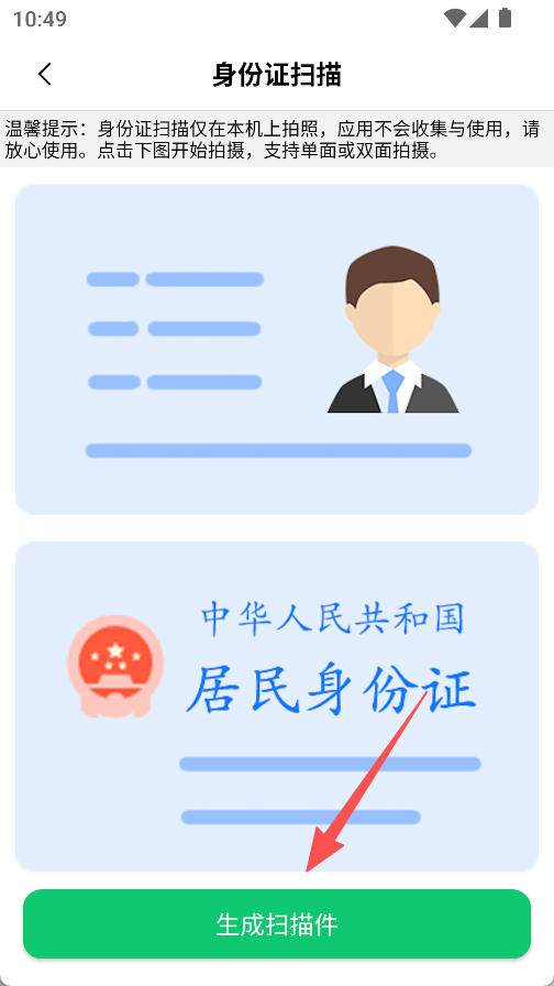 2、进入身份证扫描页,点击“生成扫描件”,可本机拍摄身份证生成扫描件。