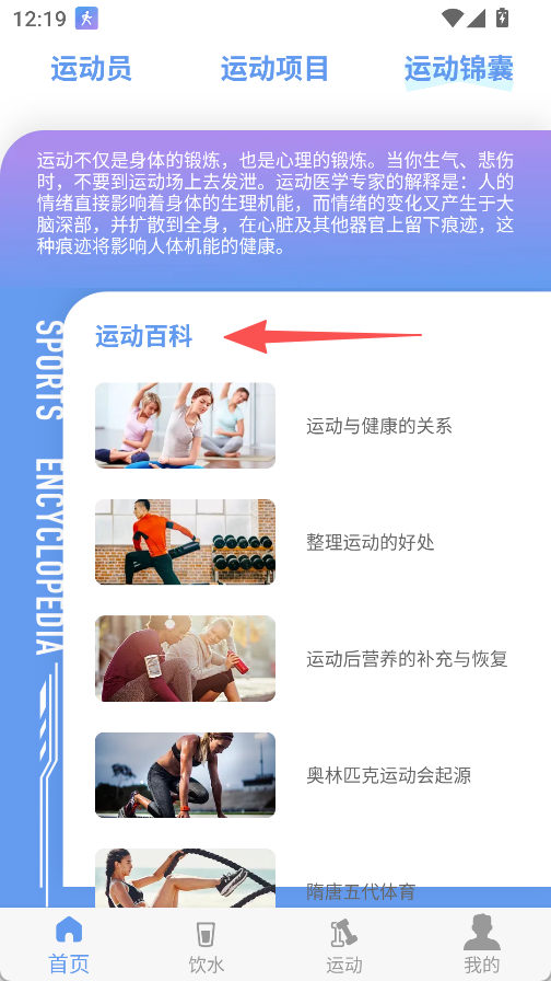 1、设置运动百科,可查看“运动与健康的关系”“运动后营养的补充与恢复”等运动知识内容。