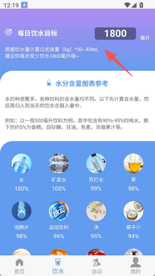 2、饮水板块能根据体重计算每日饮水目标,同时提供水分含量图表参考饮品的水分占比。