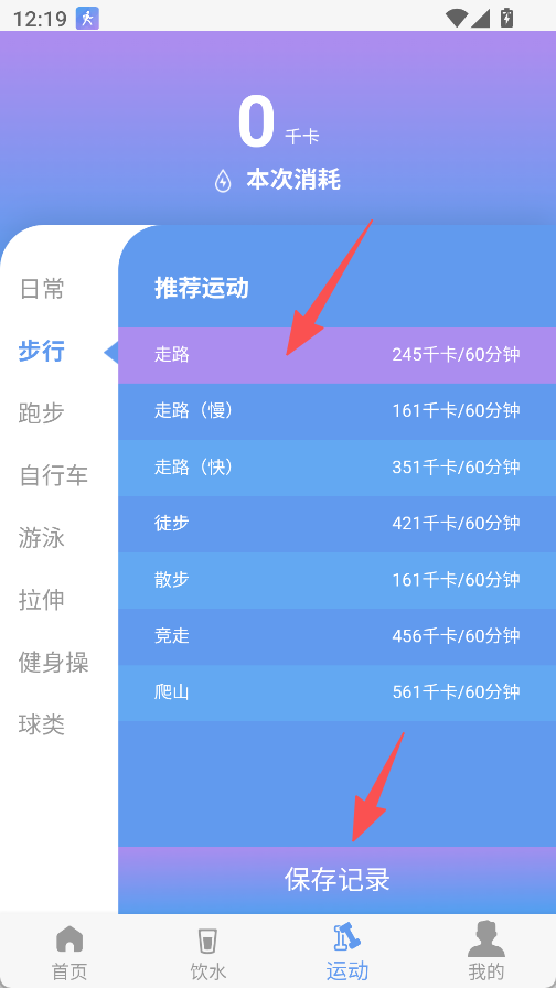 3、有走路、跑步、游泳等推荐运动选项,可查看运动消耗的千卡数,点击“保存记录”留存运动数据