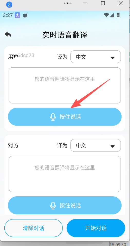 2、进入“实时语音翻译”页,按住“按住说话”按钮可进行语音翻译。