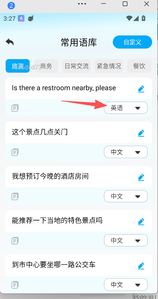 2、常用语库场景覆盖全面,旅游、商务等场景语句丰富,且支持自定义,可补充专属常用语。
