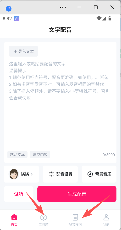 《配音大师》可进行文字配音,能导入或粘贴要配音的文字,规范使用标点可让配音更准确,还能选择配音人员、进行配音设置、添加背景音乐。工具箱具备多人配音、视频配音功能,还有音频降噪、背景音处理、文案提取等工具。配音样例包含抖音热门、广告促销、童声、方言等类别,提供多款配音角色供选择。