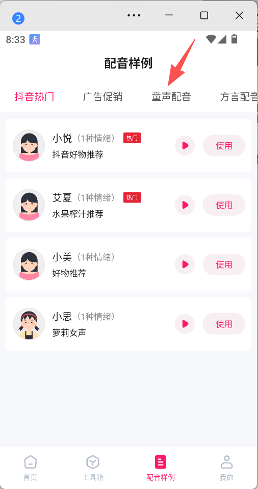 3、打开“配音样例”、能选择抖音热门、广告促销、童声配音等不同类别的配音样例。