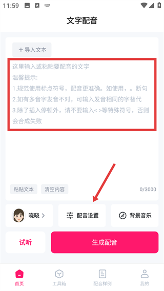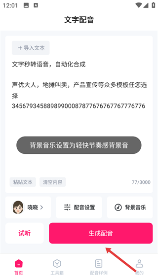 1、在首页输入或粘贴要配音的文字、选择配音人员及进行配音设置、点击“生成配音”。