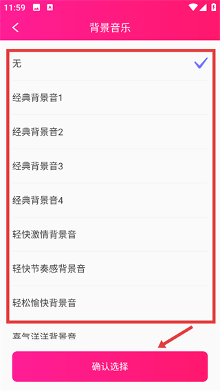 3、进入【背景音乐】页,选喜欢的音乐后点【确认选择】哦。