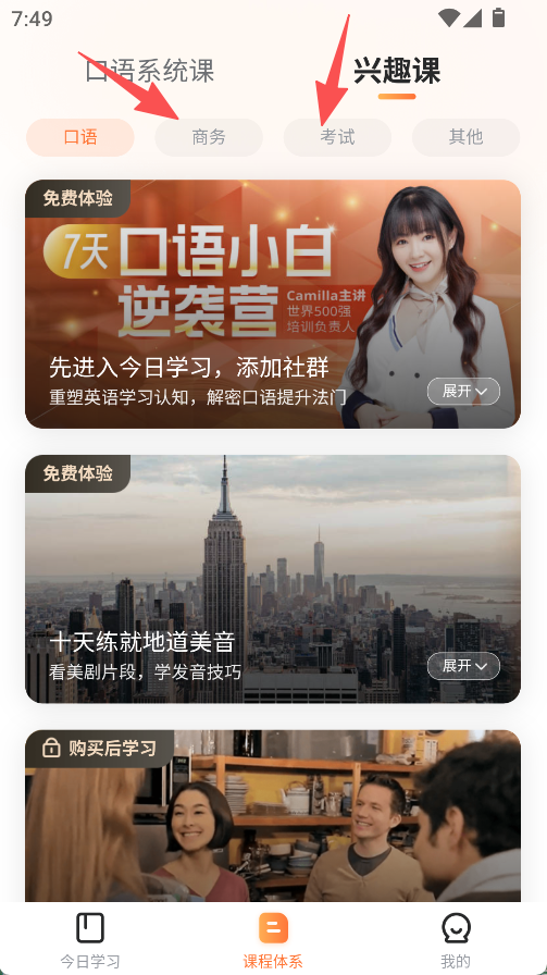 《e刻英语》课程体系丰富,设有“口语系统课”和“兴趣课”。“兴趣课”包含口语、商务、考试、其他等类别。口语类有免费体验的“7天口语小白逆袭营”“十天练就地道美音”等课程;商务类推出BEC商务英语课程,涵盖商务词汇、不同级别主题篇;考试类有大学英语四、六级备考课程。课程分免费体验和购买后学习,能满足口语提升、职场商务英语学习、考试冲刺等多种需求。
