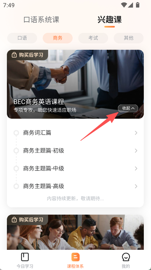 2、在“商务”分类下,找到“BEC商务英语课程”,点击课程右侧“展开”。