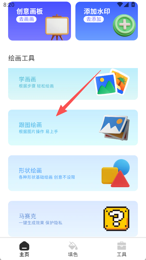 2、点击跟图绘画工具,跟随参考线条勾勒画面细节,也可切换形状绘画工具辅助创作。