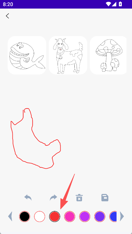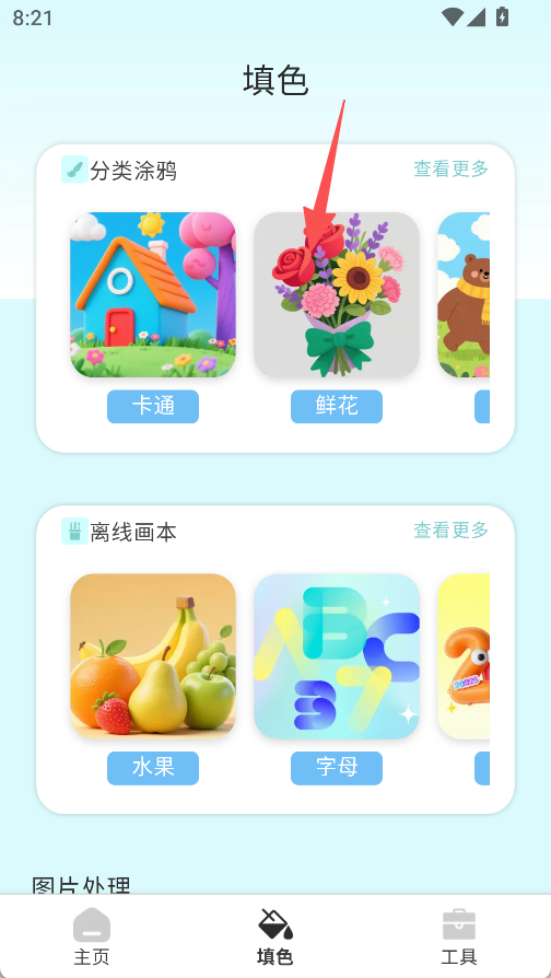 2、离线填色功能包含多类主题图案,选择对应图案后,无需联网即可使用色彩工具填充,完成后可保存作品。
