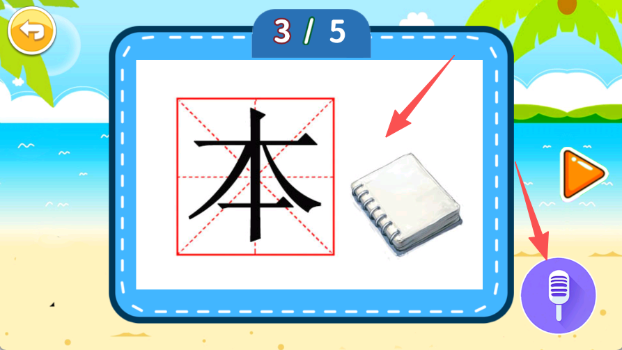 2、进入学习环节、看汉字与对应事物,按提示做语音互动。