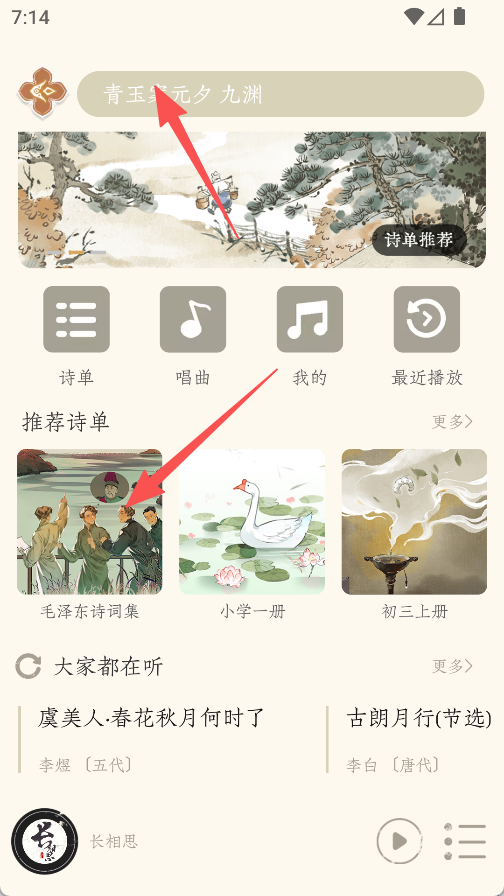 2、包含多样诗单,诗单内诗词支持播放收听,感受诗词韵律。