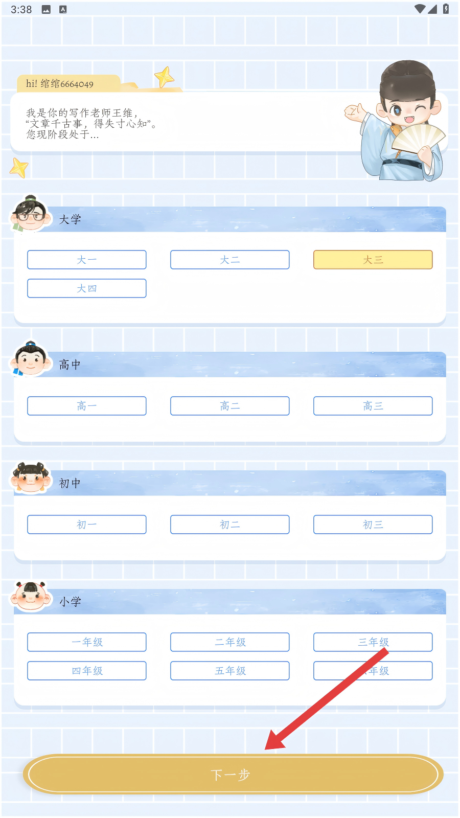 2、在学段选择界面选好对应学段后,点击【下一步】,就能进入专属写作指导环节,让写作更贴合你的学习阶段啦。