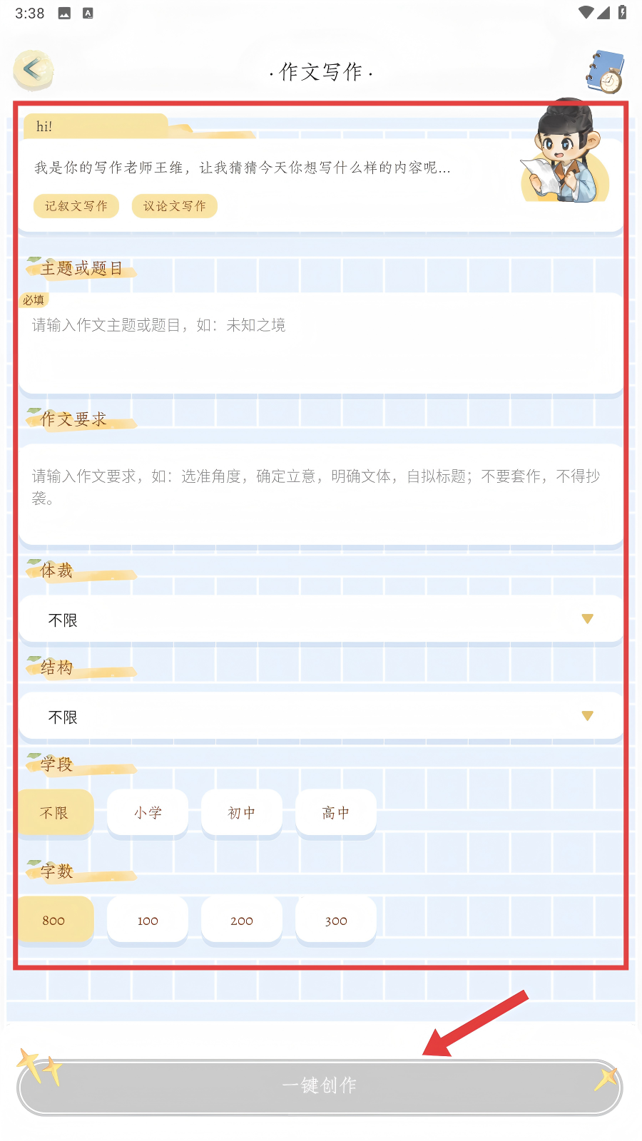 4、在作文写作页面,填好【主题或题目】等,选好体裁、结构等,点击【一键创作】,专属作文就生成啦。