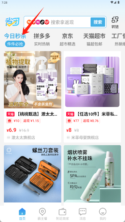 2、聚合多平台电商资源,提供领券返现与今日秒杀等福利。
