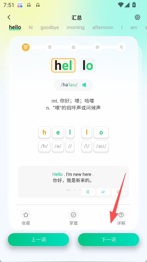 3、查看单词详解内容,深入理解单词用法,结合学习过程中的难点巩固单词记忆。