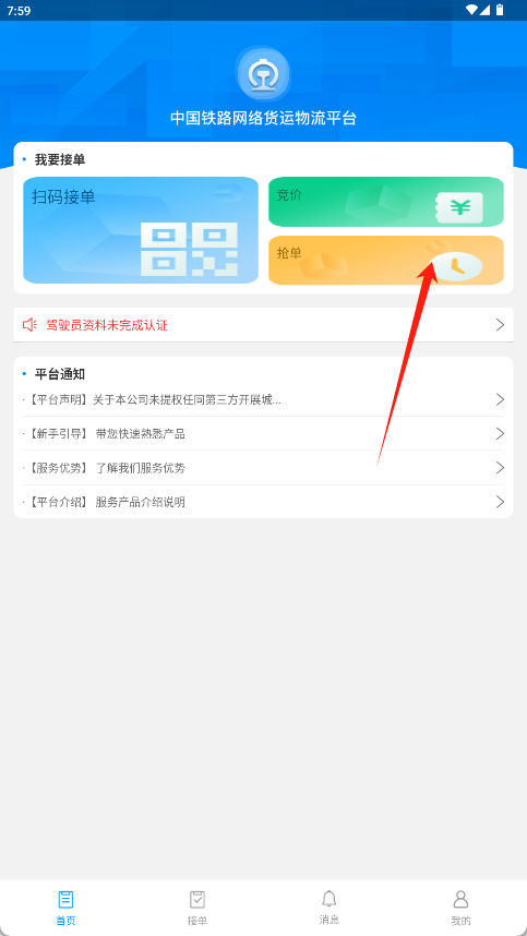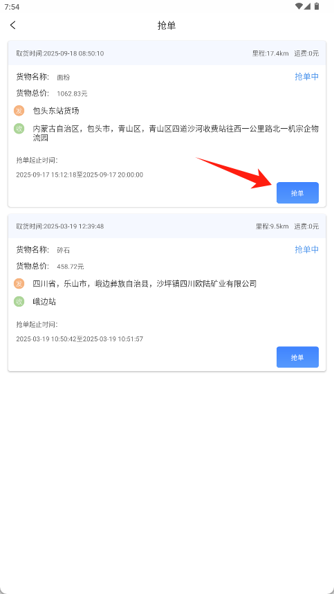 3、选择合适订单点击“抢单”按钮,查看货物详情、路线、运费及运输任务。